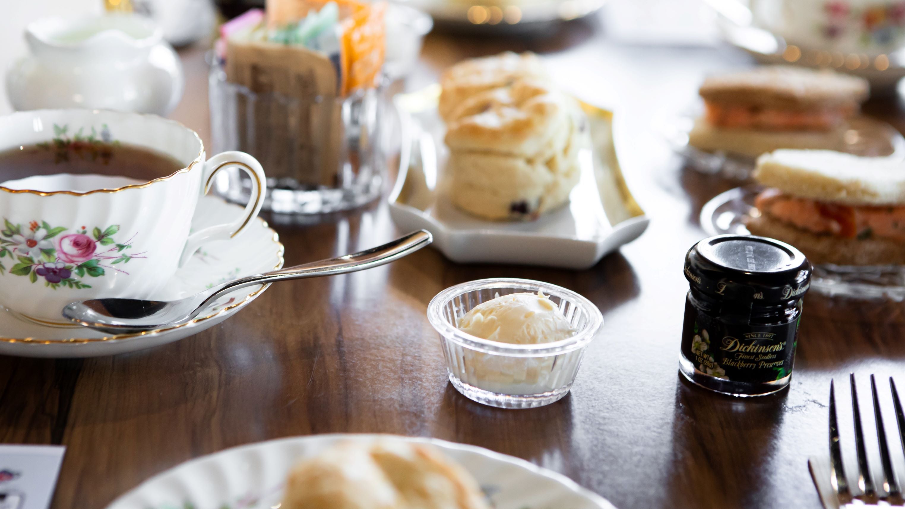 Each guest receives up to four pots of tea, a choice of soup or salad, four types of tea sandwiches (smoked salmon, turkey cranberry, tomato cheddar, and cucumber/cream cheese), house-made English scones with Devonshire cream and jam, and choice of dessert.