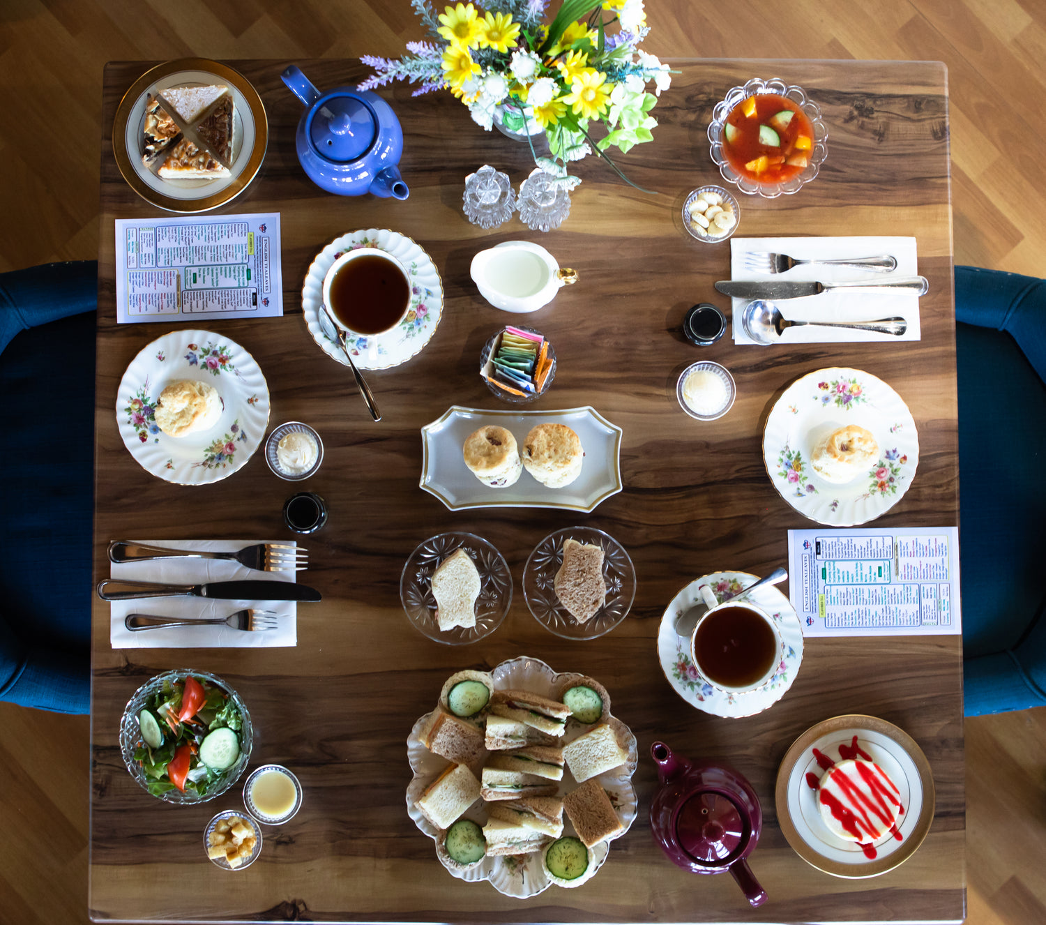 Each guest receives up to four pots of tea, a choice of soup or salad, four types of tea sandwiches (smoked salmon, turkey cranberry, tomato cheddar, and cucumber/cream cheese), house-made English scones with Devonshire cream and jam, and choice of dessert.
