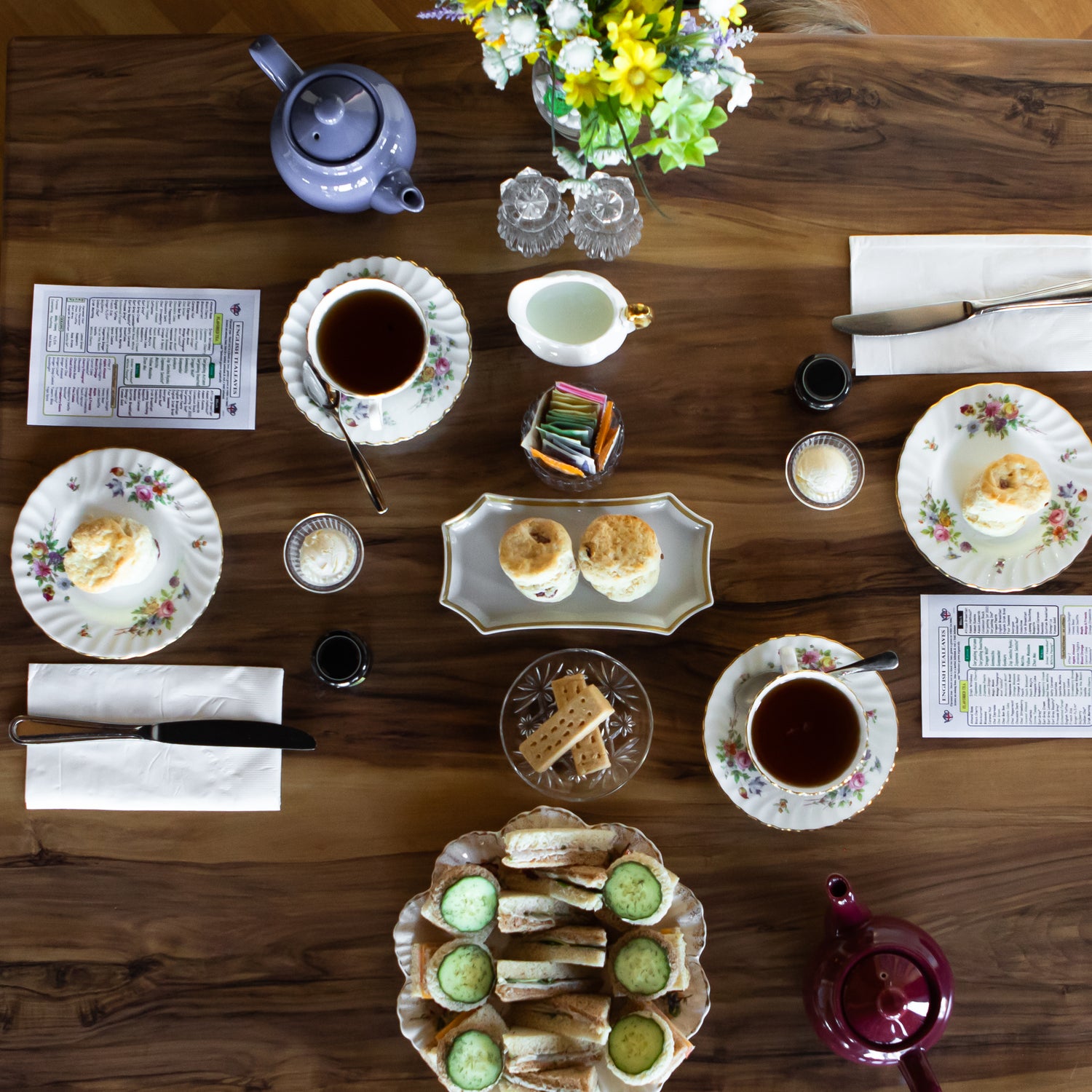 Each guest receives up to three pots of tea, three types of tea sandwiches (turkey cranberry, tomato cheddar, and cucumber/cream cheese), house-made English scones with Devonshire cream and jam, and an English biscuit (cookie).