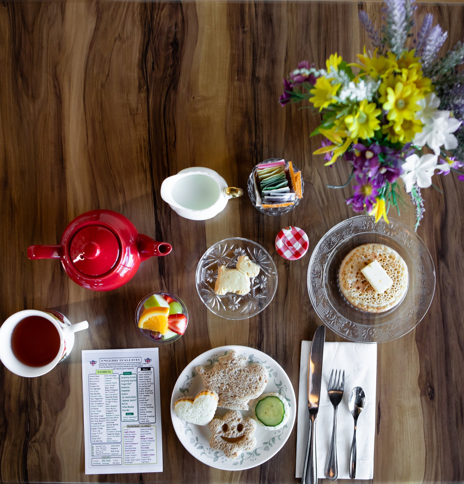 Each child will receive one pot of tea (caffeine-free varieties available), kid-friendly tea sandwiches, choice of a scone or a crumpet with butter and jam, fresh fruit and an English biscuit (cookie).